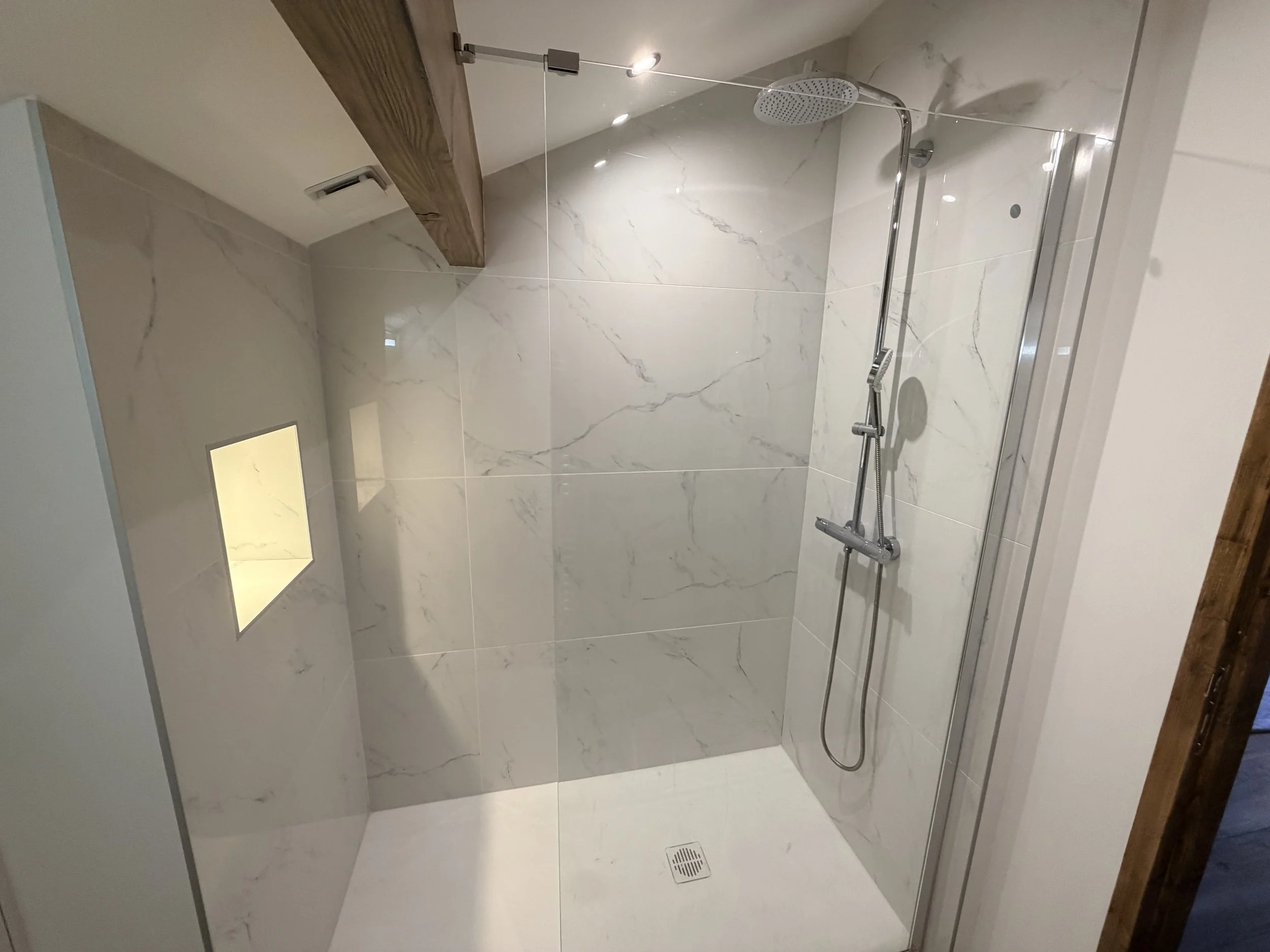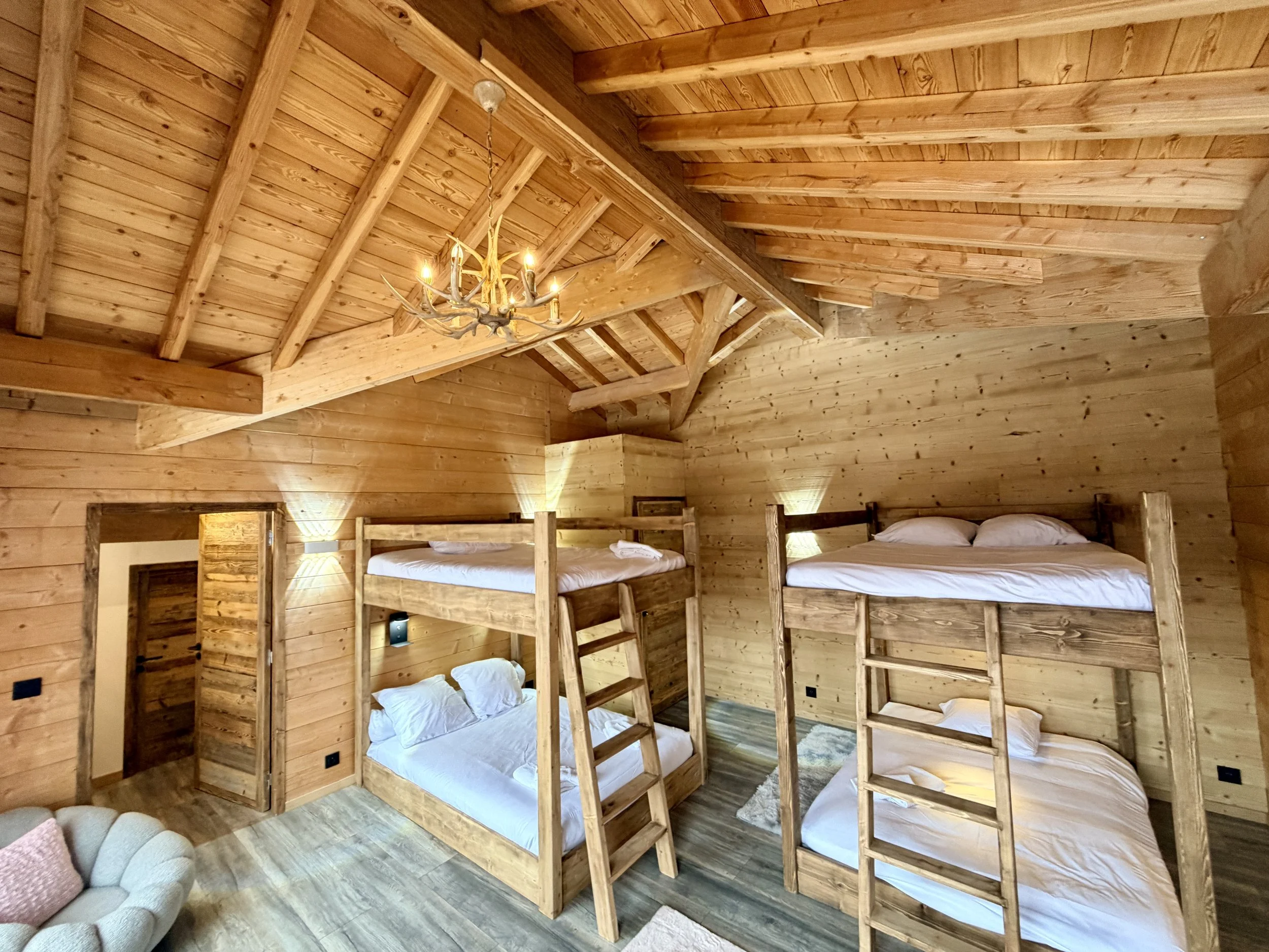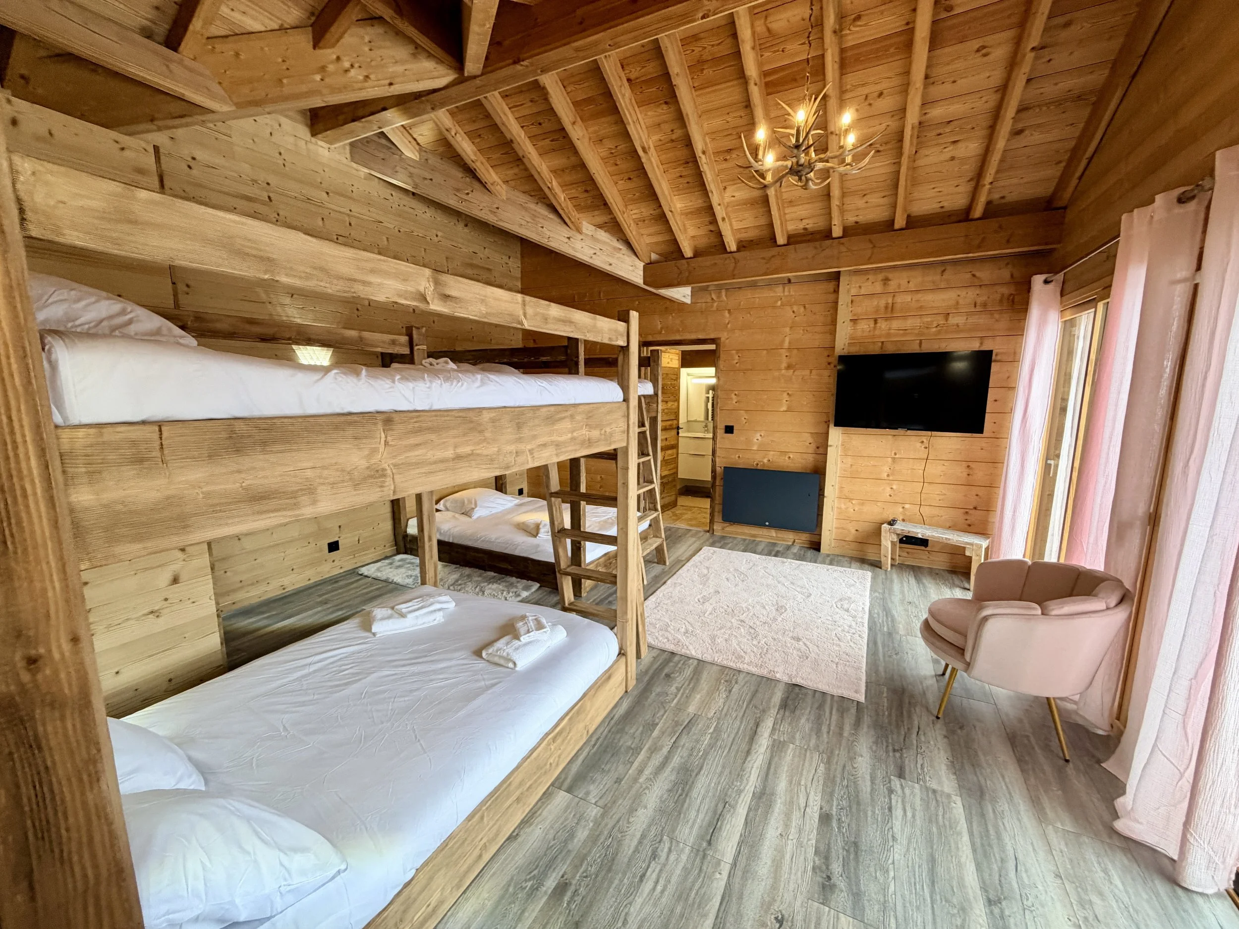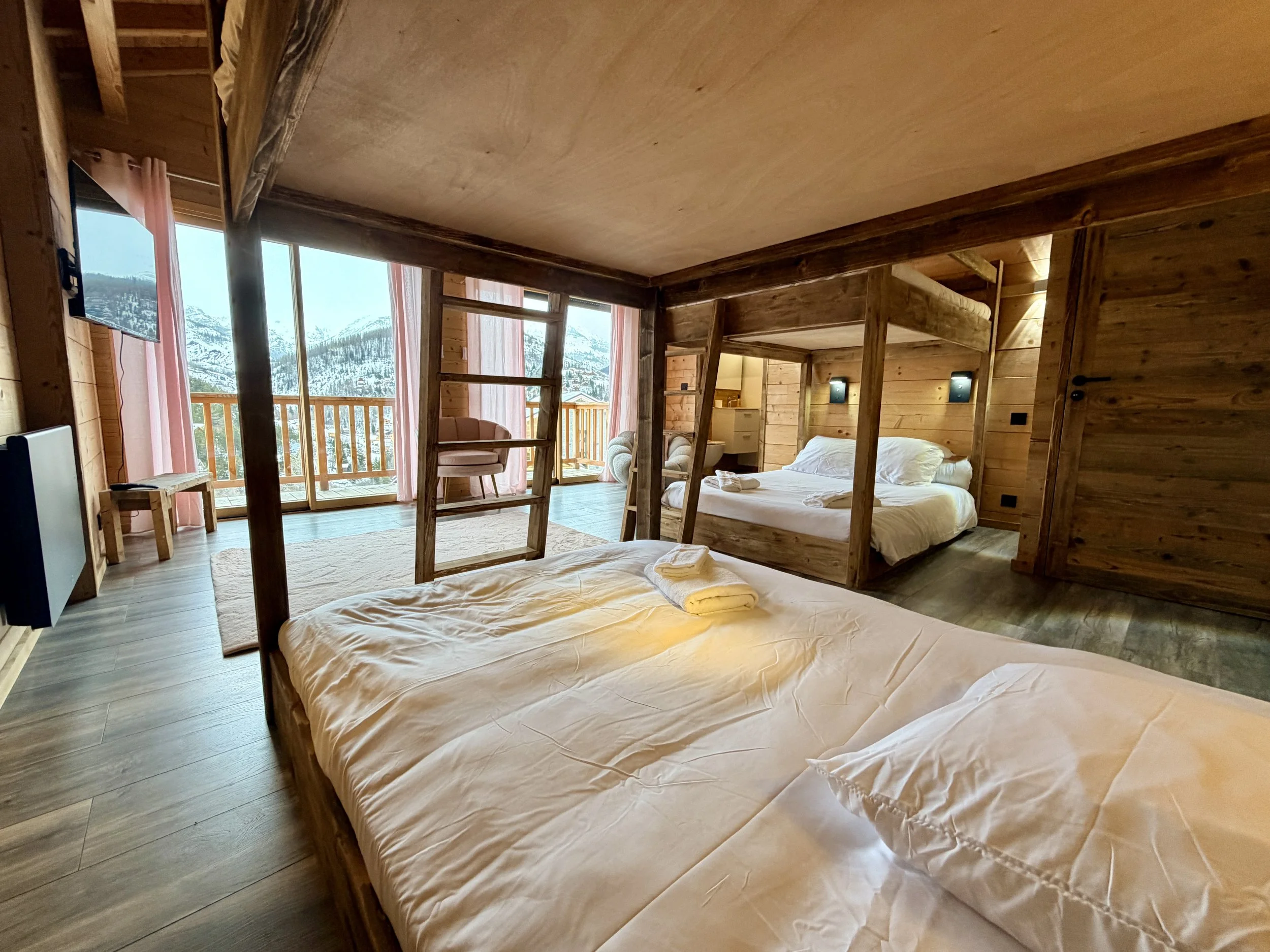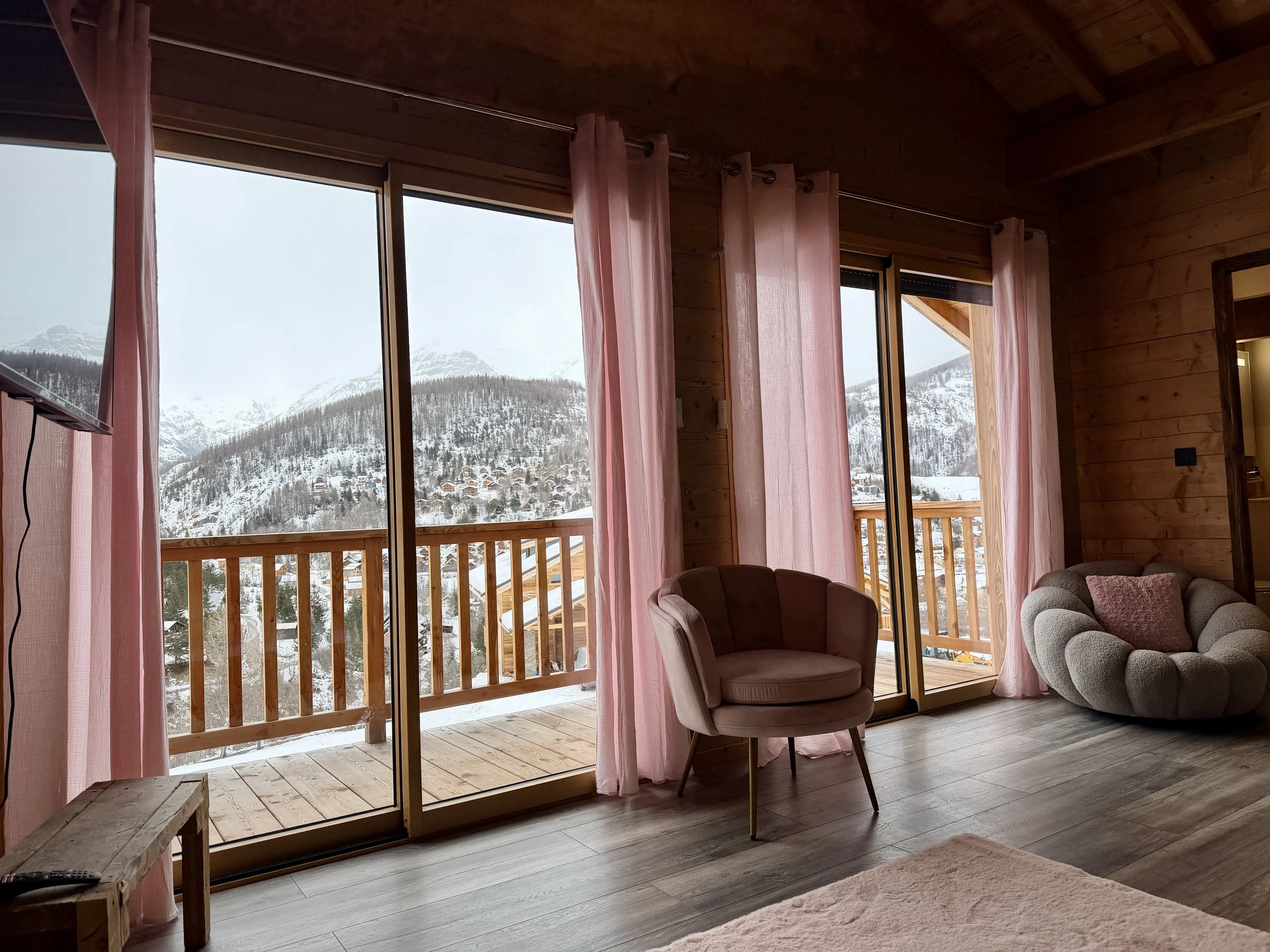 Chambre élégante et raffinée, vue sur les montagnes et le village d’Allos.